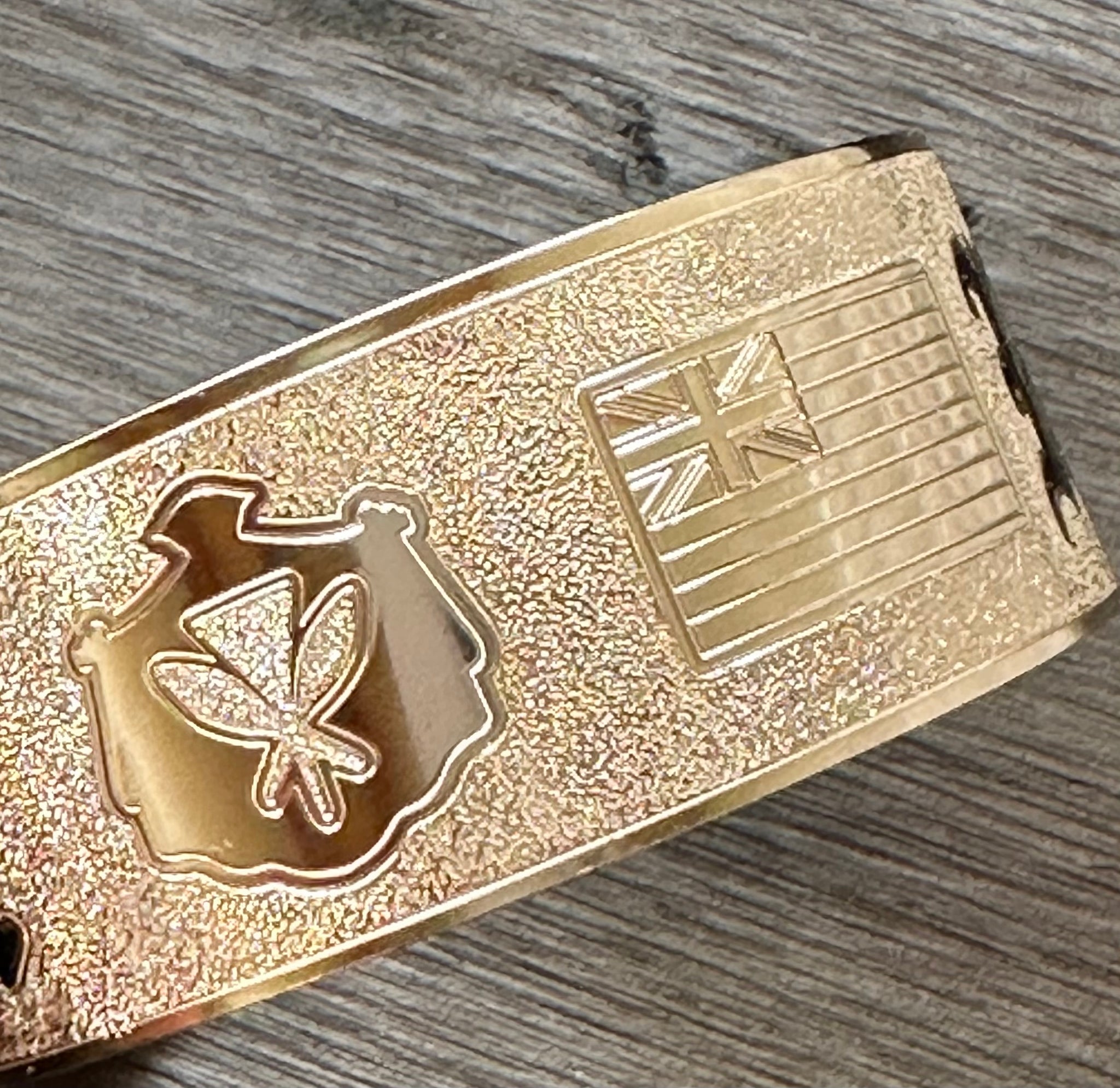 This custom piece is made from 14kt Gold-Filled Sheet. 14kt gold is pressure bonded to the inner metal made of 90% copper and 10% zinc, the thin edge may darken over time but can be buffed with a polishing cloth. You can still bathe and swim with it but are advised to stay away from cholorine.
